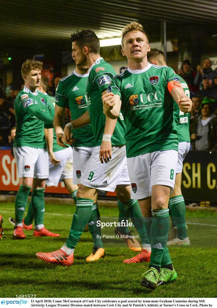 13 April 2018; Conor McCormack of Cork City celebrates a goal scored by team-mate Graham Cummins during SSE Airtricity League Premier Division match between Cork City and St Patrick's Athletic at Turner's Cross in Cork. Photo by Piaras Ó Mídheach/Sportsfile