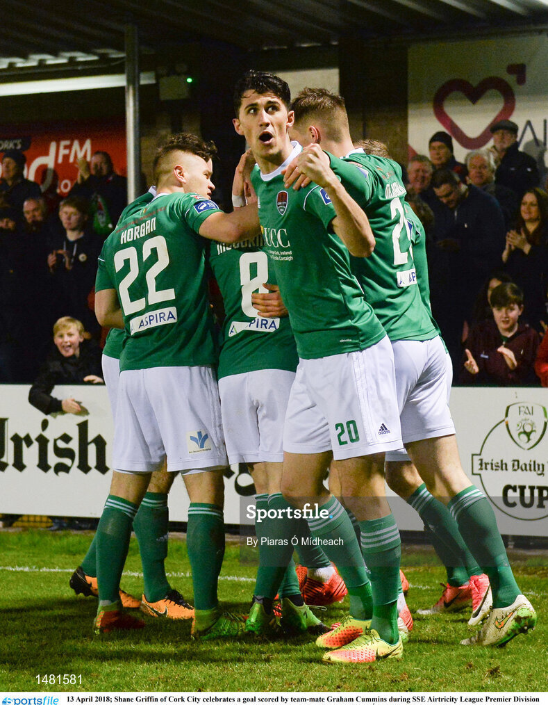 13 April 2018; Shane Griffin of Cork City celebrates a goal scored by team-mate Graham Cummins during SSE Airtricity League Premier Division match between Cork City and St Patrick's Athletic at Turner's Cross in Cork. Photo by Piaras Ó Mídheach/Sportsfile
