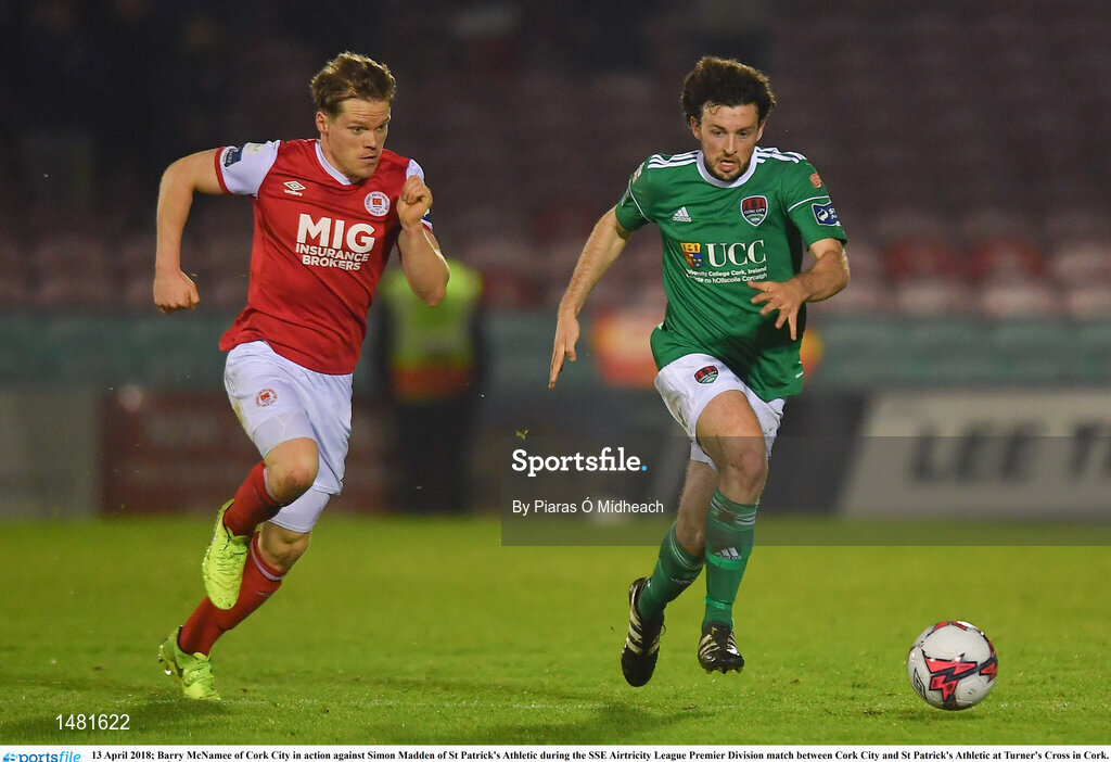 13 April 2018; Barry McNamee of Cork City in action against Simon Madden of St Patrick's Athletic during the SSE Airtricity League Premier Division match between Cork City and St Patrick's Athletic at Turner's Cross in Cork. Photo by Piaras Ó Mídheach/Sportsfile