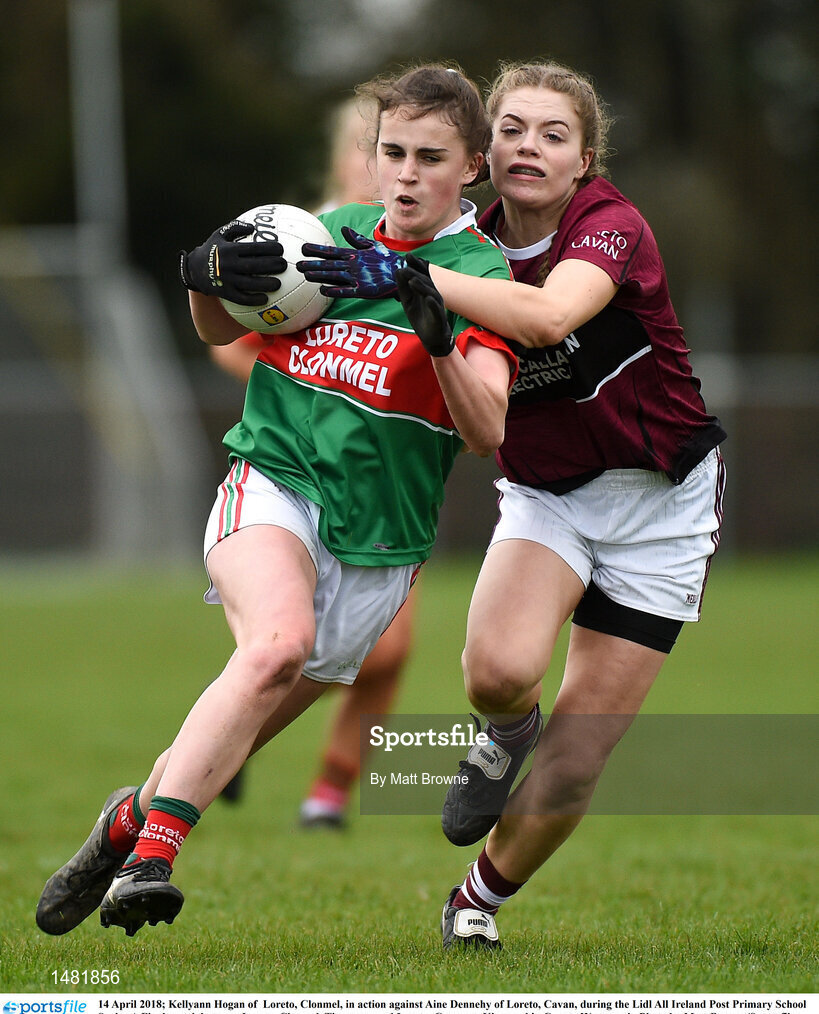 14 April 2018; Kellyann Hogan of Loreto, Clonmel, in action against Aine Dennehy of Loreto, Cavan, during the Lidl All Ireland Post Primary School Senior A Final match between Loreto, Clonmel, Tipperary and Loreto, Cavan at Kinnegad in County Westmeath. Photo by Matt Browne/Sportsfile