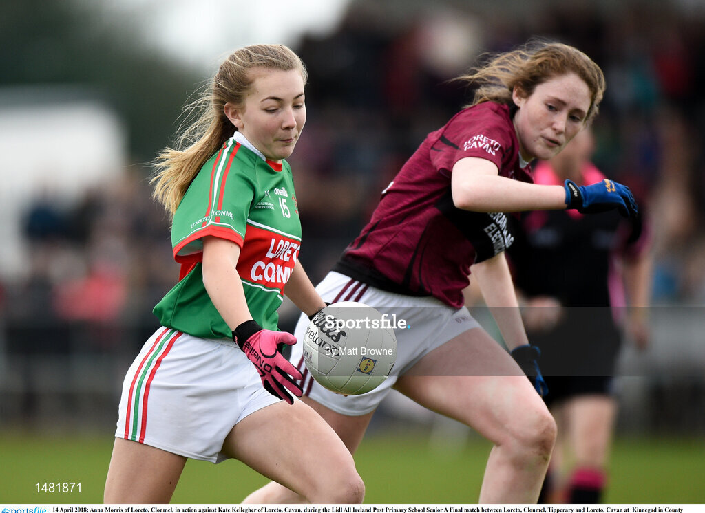 14 April 2018; Anna Morris of Loreto, Clonmel, in action against Kate Kellegher of Loreto, Cavan, during the Lidl All Ireland Post Primary School Senior A Final match between Loreto, Clonmel, Tipperary and Loreto, Cavan at Kinnegad in County Westmeath. Photo by Matt Browne/Sportsfile