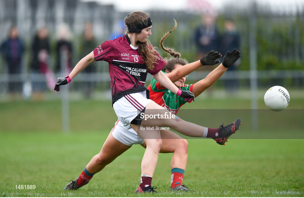 14 April 2018; Muireann Cusack of Loreto, Cavan, scores her side's third goal despite the efforts of Sadhbh Hallinan of Loreto, Clonmel, during the Lidl All Ireland Post Primary School Senior A Final match between Loreto, Clonmel, Tipperary and Loreto, Cavan at Kinnegad in County Westmeath. Photo by Matt Browne/Sportsfile
