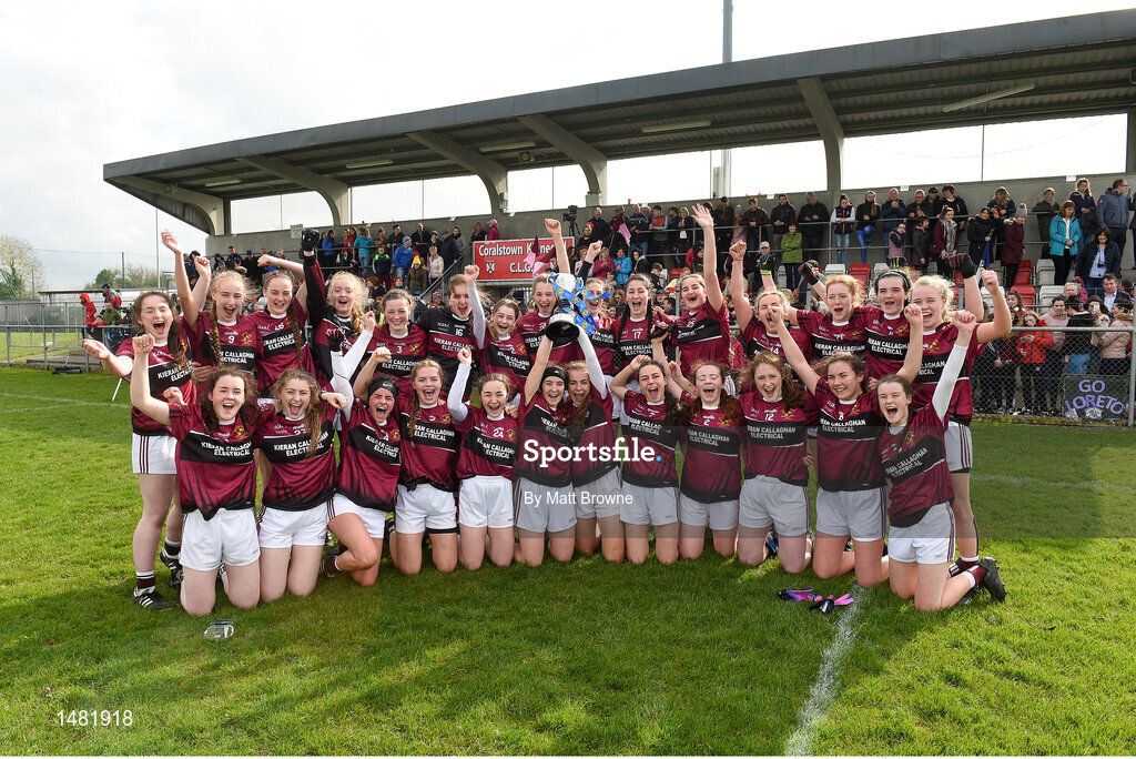 14 April 2018; Loreto, Cavan, team captains Muireann Cusack, left, and Niamh Keenaghan lift the cup as their team-mates celebrate after the Lidl All Ireland Post Primary School Senior A Final match between Loreto, Clonmel, Tipperary and Loreto, Cavan at Kinnegad in County Westmeath. Photo by Matt Browne/Sportsfile