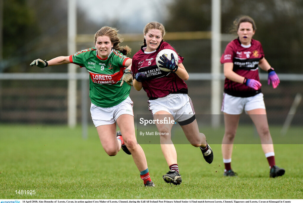 14 April 2018; Aine Dennehy of Loreto, Cavan, in action against Cora Maher of Loreto, Clonmel, during the Lidl All Ireland Post Primary School Senior A Final match between Loreto, Clonmel, Tipperary and Loreto, Cavan at Kinnegad in County Westmeath. Photo by Matt Browne/Sportsfile