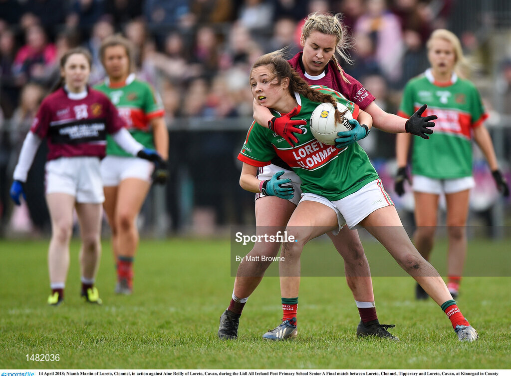 14 April 2018; Niamh Martin of Loreto, Clonmel, in action against Aine Reilly of Loreto, Cavan, during the Lidl All Ireland Post Primary School Senior A Final match between Loreto, Clonmel, Tipperary and Loreto, Cavan, at Kinnegad in County Westmeath. Photo by Matt Browne/Sportsfile