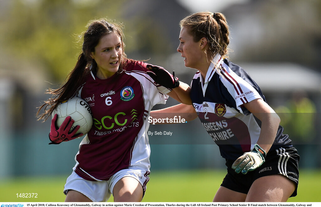 15 April 2018; Cailiosa Keaveney of Glenamaddy, Galway in action against Marie Creedon of Presentation, Thurles during the Lidl All Ireland Post Primary School Senior B Final match between Glenamaddy, Galway and Presentation, Thurles, Tipperary at Duggan Park in Ballinasloe, Co Galway. Photo by Seb Daly/Sportsfile