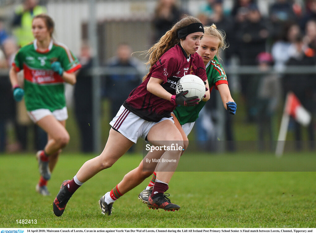 14 April 2018; Muireann Cusack of Loreto, Cavan in action against Veerle Van Der Wal of Loreto, Clonmel during the Lidl All Ireland Post Primary School Senior A Final match between Loreto, Clonmel, Tipperary and Loreto, Cavan at Kinnegad in County Westmeath. Photo by Matt Browne/Sportsfile