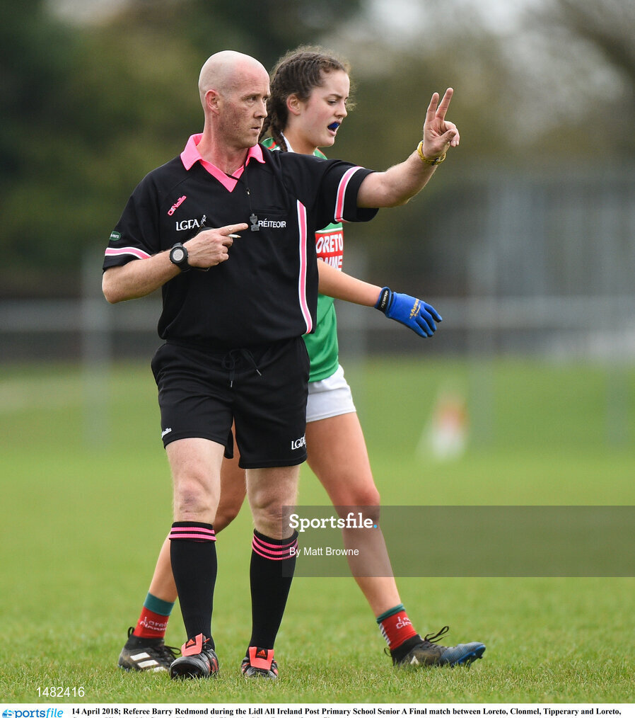 14 April 2018; Referee Barry Redmond during the Lidl All Ireland Post Primary School Senior A Final match between Loreto, Clonmel, Tipperary and Loreto, Cavan at Kinnegad in County Westmeath. Photo by Matt Browne/Sportsfile