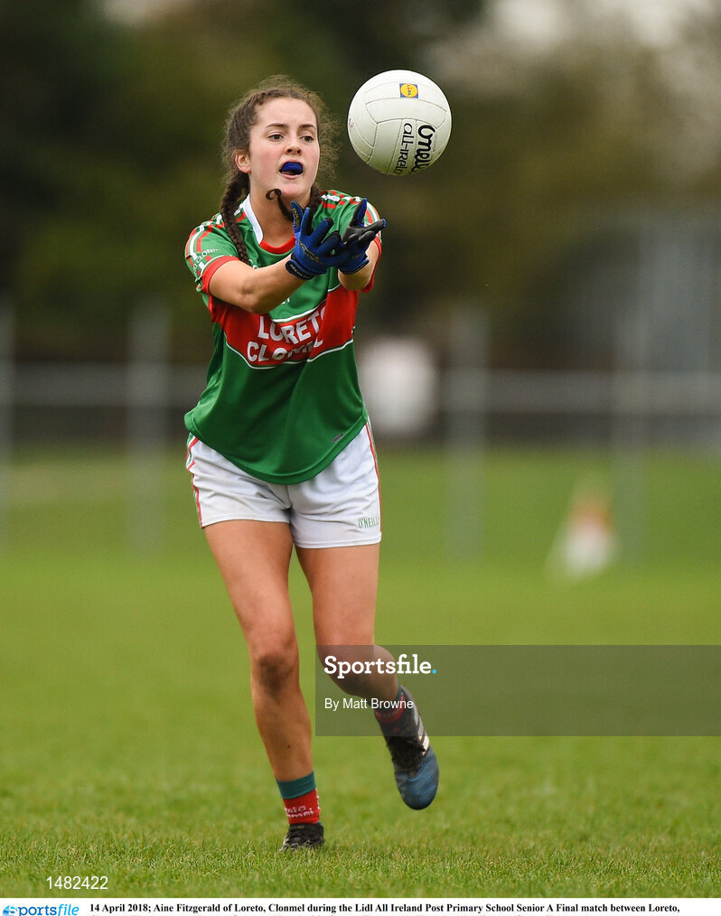 14 April 2018; Aine Fitzgerald of Loreto, Clonmel during the Lidl All Ireland Post Primary School Senior A Final match between Loreto, Clonmel, Tipperary and Loreto, Cavan at Kinnegad in County Westmeath. Photo by Matt Browne/Sportsfile