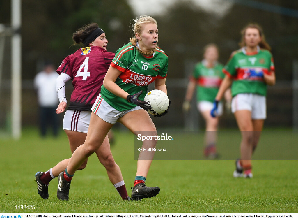 14 April 2018; Anna Carey of Loreto, Clonmel in action against Eadaoin Gallaigan of Loreto, Cavan during the Lidl All Ireland Post Primary School Senior A Final match between Loreto, Clonmel, Tipperary and Loreto, Cavan at Kinnegad in County Westmeath. Photo by Matt Browne/Sportsfile