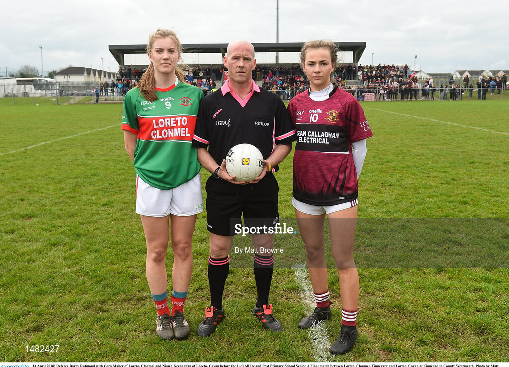 14 April 2018; Referee Barry Redmond with Cora Maher of Loreto, Clonmel and Niamh Keenaghan of Loreto, Cavan before the Lidl All Ireland Post Primary School Senior A Final match between Loreto, Clonmel, Tipperary and Loreto, Cavan at Kinnegad in County Westmeath. Photo by Matt Browne/Sportsfile