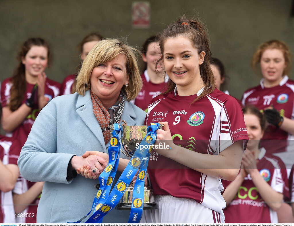 15 April 2018; Glenamaddy, Galway captain Maeve Flanagan is presented with the trophy by President of the Ladies Gaelic Football Association Maire Hickey following the Lidl All Ireland Post Primary School Senior B Final match between Glenamaddy, Galway and Presentation, Thurles, Tipperary at Duggan Park in Ballinasloe, Co Galway. Photo by Seb Daly/Sportsfile