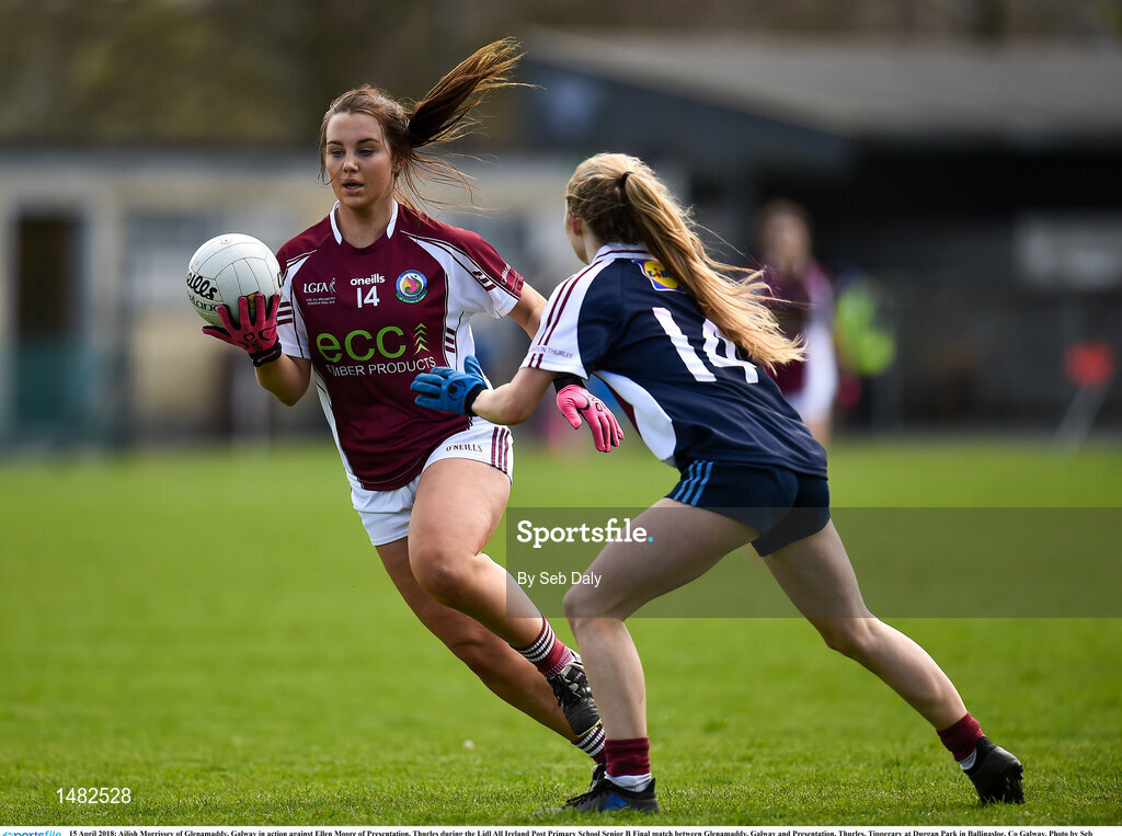15 April 2018; Ailish Morrissey of Glenamaddy, Galway in action against Ellen Moore of Presentation, Thurles during the Lidl All Ireland Post Primary School Senior B Final match between Glenamaddy, Galway and Presentation, Thurles, Tipperary at Duggan Park in Ballinasloe, Co Galway. Photo by Seb Daly/Sportsfile