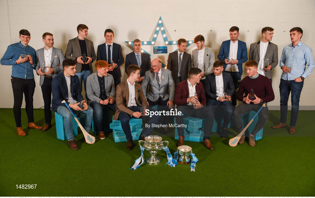 16 April 2018; The hurling team with Uachtarán Chumann Lúthchleas Gael John Horan, Jim Dollard, Executive Director Electric Ireland, and Gerry Tully, Chairman of Comhairle Ardoideachais CLG, at the Electric Ireland HE GAA Football & Hurling Rising Stars Awards for 2018, in Croke Park. The awards acknowledge outstanding performances in the battle for third level football and hurling Championships and come at the end of what was an epic season of GAA action. Photo by Stephen McCarthy/Sportsfile