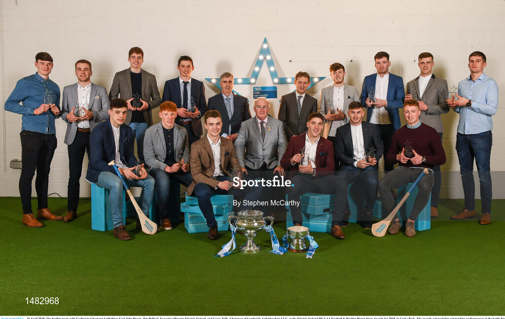 16 April 2018; The hurling team with Uachtarán Chumann Lúthchleas Gael John Horan, Jim Dollard, Executive Director Electric Ireland, and Gerry Tully, Chairman of Comhairle Ardoideachais CLG, at the Electric Ireland HE GAA Football & Hurling Rising Stars Awards for 2018, in Croke Park. The awards acknowledge outstanding performances in the battle for third level football and hurling Championships and come at the end of what was an epic season of GAA action. Photo by Stephen McCarthy/Sportsfile