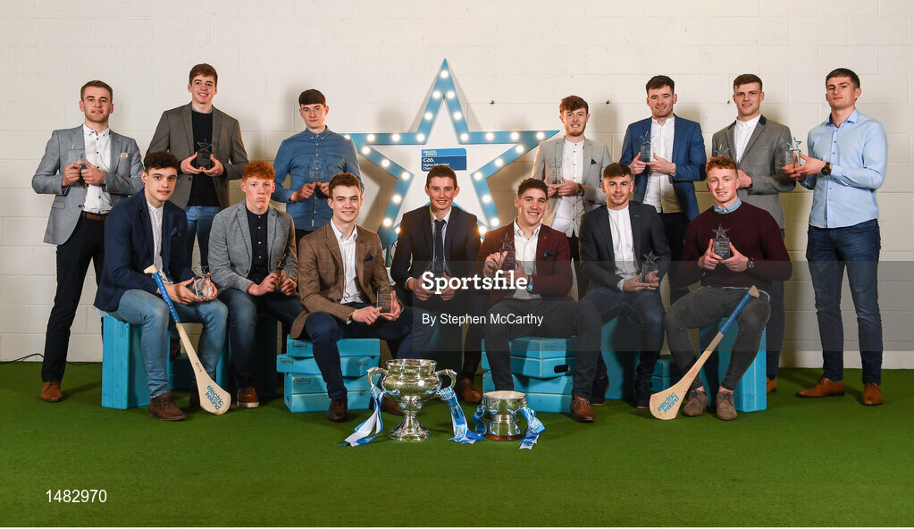 16 April 2018; The hurling team at the Electric Ireland HE GAA Football & Hurling Rising Stars Awards for 2018, in Croke Park. The awards acknowledge outstanding performances in the battle for third level football and hurling Championships and come at the end of what was an epic season of GAA action. Back Row, from left: UL hurler John McGrath from Tipperary, DCU hurler Donal Burke from Dublin, UL hurler David Fitzgerald from Clare, DCU hurler Joe O’Connor from Wexford, Carlow IT hurler Martin Kavanagh from Carlow, Maynooth University hurler Brian Hogan from Tipperary, UL hurler Conor Cleary from Clare. Front Row, from left: DCU hurler Eoghan O'Donnell, from Dublin, DCU hurler John Donnelly from Kilkenny, UL hurler David McCarthy from Limerick, UL hurler Gearóid Hegarty from Limerick, UL hurler Seán Finn from Limerick, Carlow IT hurler Colin Dunford from Waterford, DIT hurler Niall O’Brien from Westmeath. Photo by Stephen McCarthy/Sportsfile