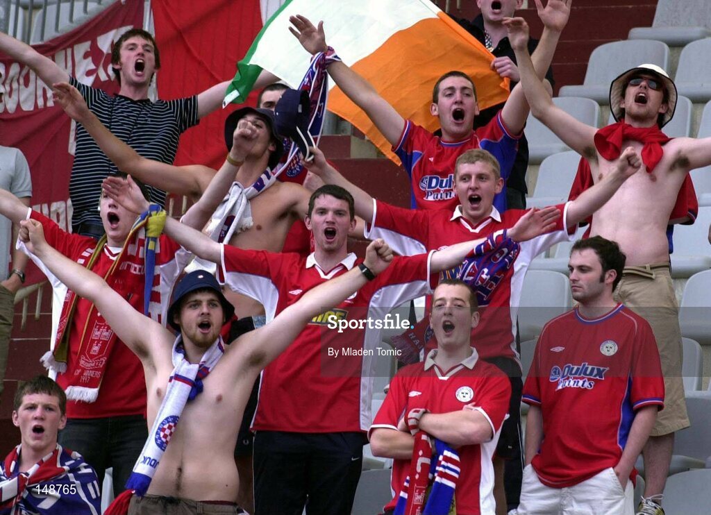 28 July 2004; Shelbourne supporters cheer on their team. UEFA Champions League, 2nd Qualifying Round, 1st Leg, Hajduk Split v Shelbourne, Hajduk Stadium, Poljud, Croatia. Picture credit; Mladen Tomic / SPORTSFILE