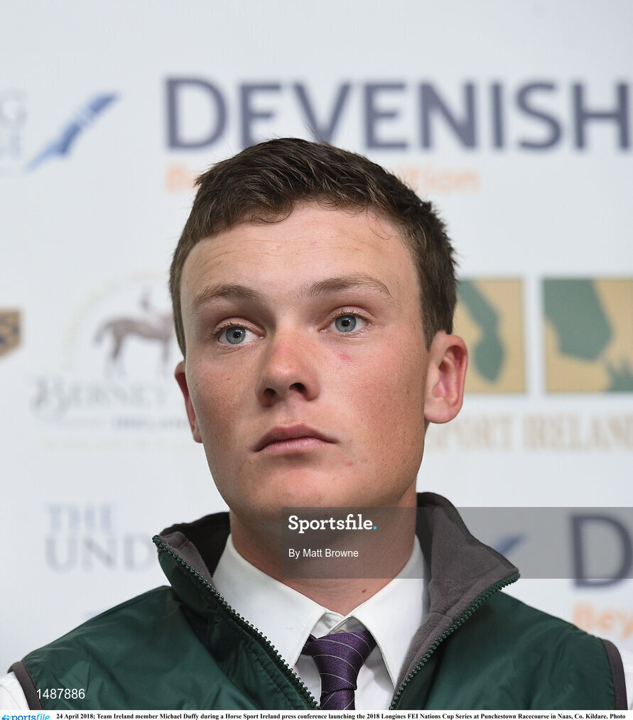 24 April 2018; Team Ireland member Michael Duffy during a Horse Sport Ireland press conference launching the 2018 Longines FEI Nations Cup Series at Punchestown Racecourse in Naas, Co. Kildare. Photo by Matt Browne/Sportsfile