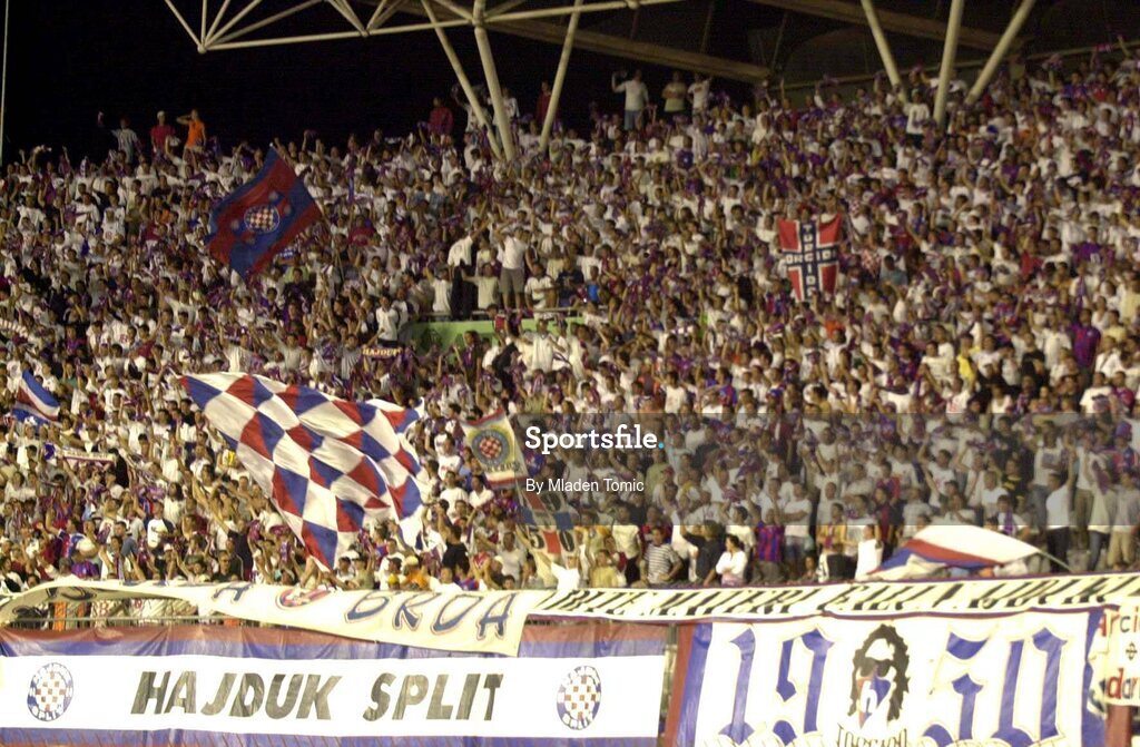 28 July 2004; Hajduk Split fans cheer on their side during the game. UEFA Champions League, 2nd Qualifying Round, 1st Leg, Hajduk Split v Shelbourne, Hajduk Stadium, Poljud, Croatia. Picture credit; Mladen Tomic / SPORTSFILE