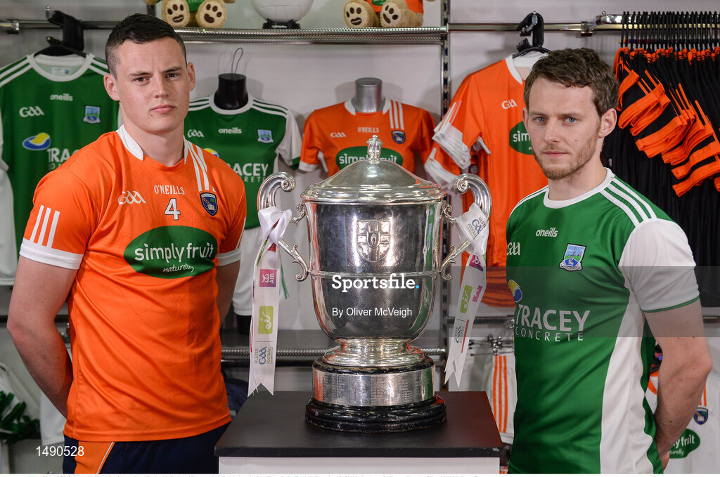 30 April 2018; Aaron McKay, left, of Armagh and Declan McCusker of Fermanagh during the launch of the Ulster Senior Football Championship 2018 in Strabane, Co Tyrone. Photo by Oliver McVeigh/Sportsfile