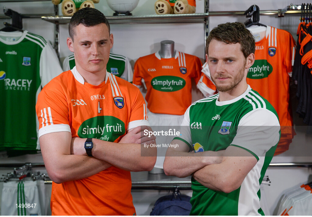 30 April 2018; Aaron McKay of Armagh and Declan McCusker of Fermanagh during the Launch of the Ulster Senior Football Championship 2018 in Strabane, Co Tyrone. Photo by Oliver McVeigh/Sportsfile
