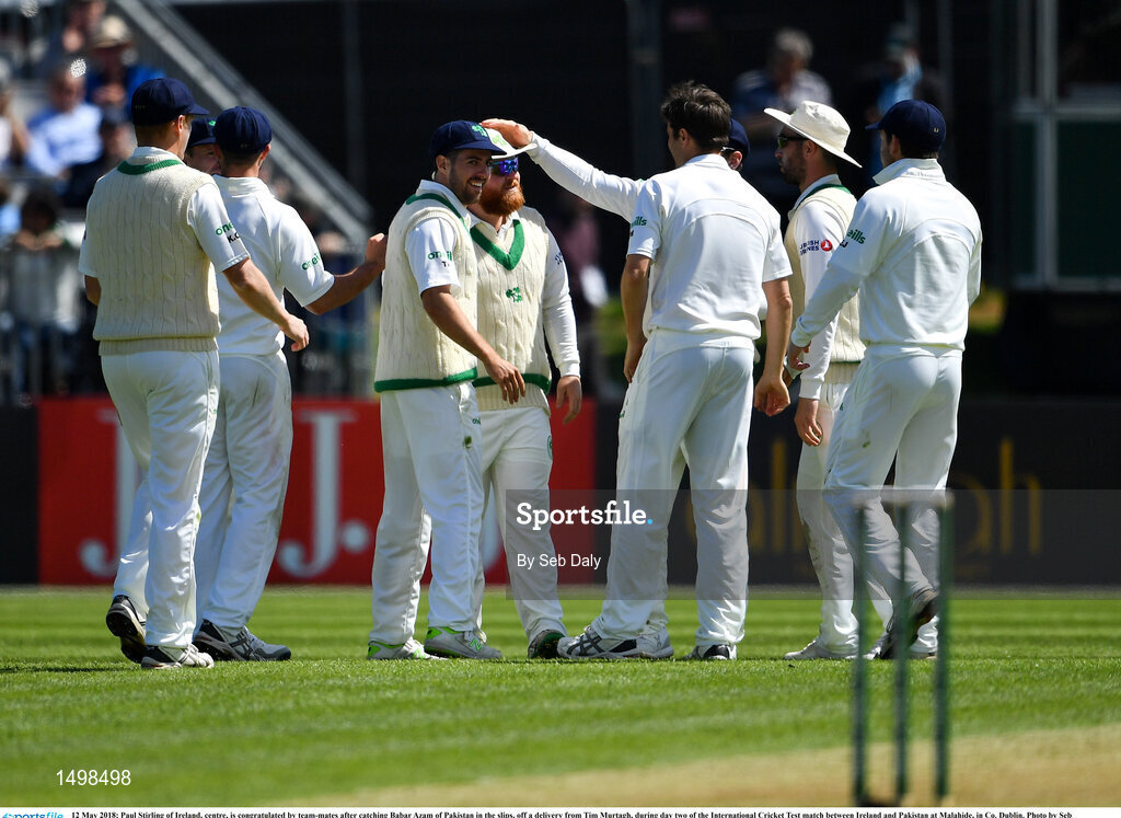 12 May 2018; Paul Stirling of Ireland, centre, is congratulated by team-mates after catching Babar Azam of Pakistan in the slips, off a delivery from Tim Murtagh, during day two of the International Cricket Test match between Ireland and Pakistan at Malahide, in Co. Dublin. Photo by Seb Daly/Sportsfile