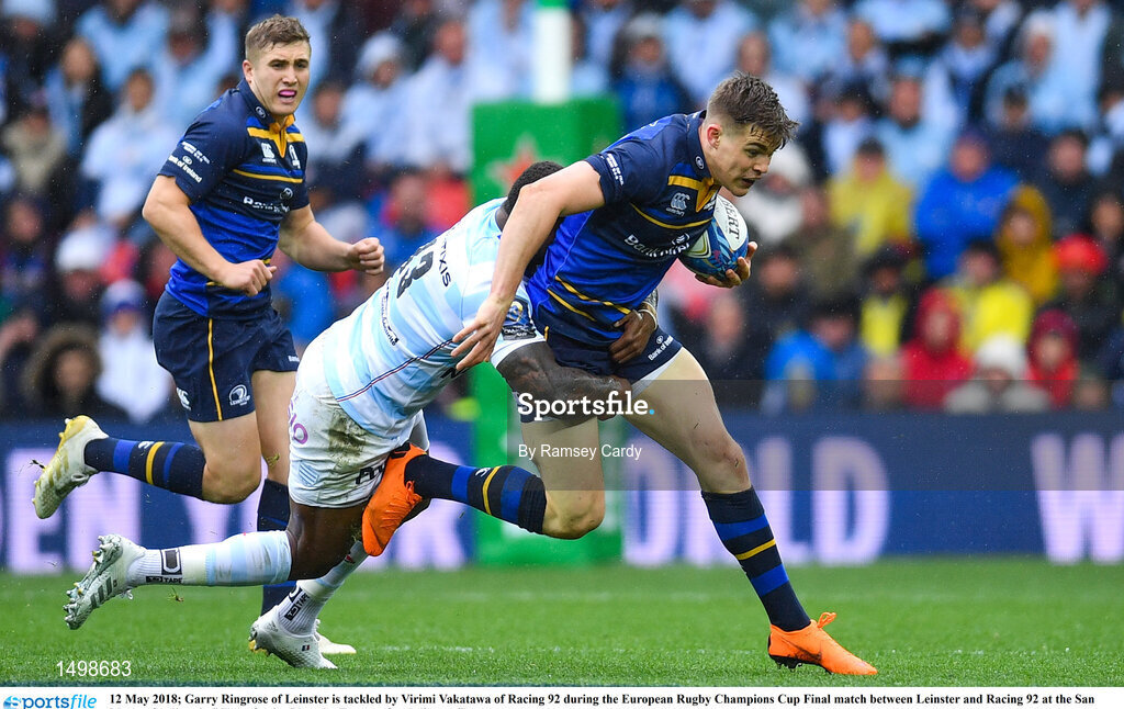 12 May 2018; Garry Ringrose of Leinster is tackled by Virimi Vakatawa of Racing 92 during the European Rugby Champions Cup Final match between Leinster and Racing 92 at the San Mames Stadium in Bilbao, Spain. Photo by Ramsey Cardy/Sportsfile