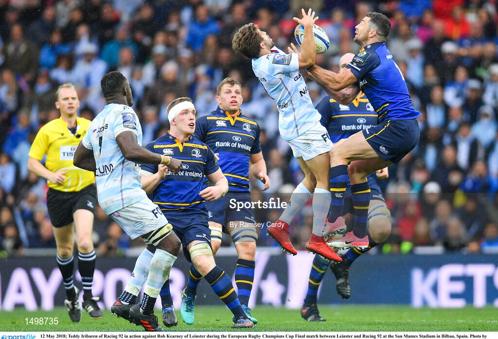 12 May 2018; Teddy Iribaren of Racing 92 in action against Rob Kearney of Leinster during the European Rugby Champions Cup Final match between Leinster and Racing 92 at the San Mames Stadium in Bilbao, Spain. Photo by Ramsey Cardy/Sportsfile