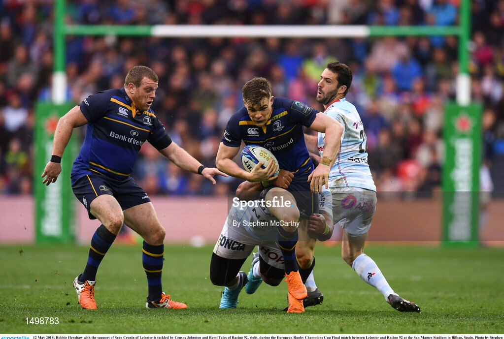 12 May 2018; Garry Ringrose of Leinster, with the support of team-mate Sean Cronin, is tackled by Census Johnston and Remi Tales of Racing 92, right, during the European Rugby Champions Cup Final match between Leinster and Racing 92 at the San Mames Stadium in Bilbao, Spain. Photo by Stephen McCarthy/Sportsfile
