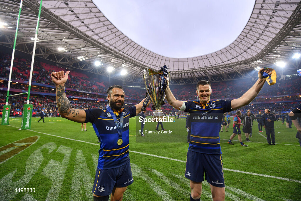 12 May 2018; Isa Nacewa, left, and Jonathan Sexton of Leinster lift the Cup and celebrate after the European Rugby Champions Cup Final match between Leinster and Racing 92 at the San Mames Stadium in Bilbao, Spain. Photo by Ramsey Cardy/Sportsfile