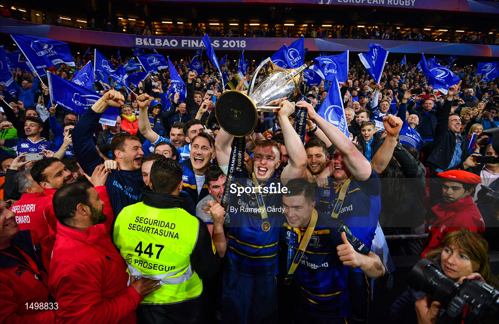 12 May 2018; Dan Leavy and Luke McGrath of Leinster lift the cup after the European Rugby Champions Cup Final match between Leinster and Racing 92 at the San Mames Stadium in Bilbao, Spain. Photo by Ramsey Cardy/Sportsfile