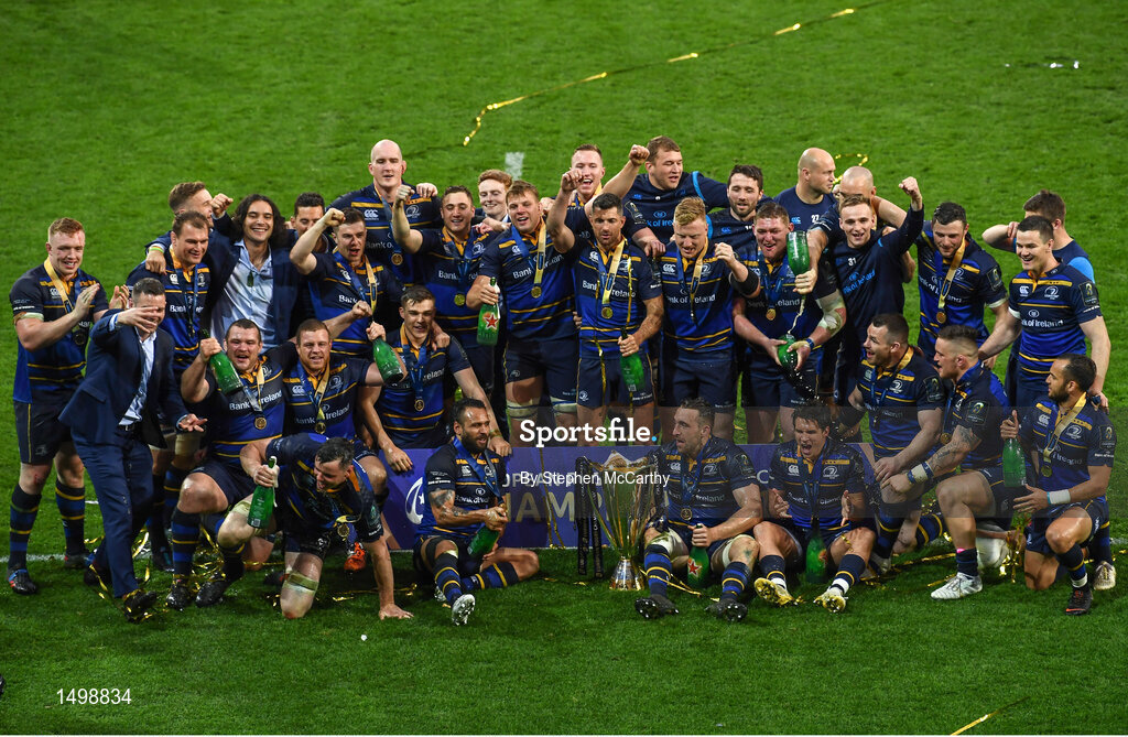 12 May 2018; The Leinster team celebrate with the cup after the European Rugby Champions Cup Final match between Leinster and Racing 92 at the San Mames Stadium in Bilbao, Spain. Photo by Stephen McCarthy/Sportsfile
