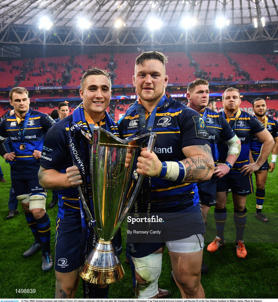 12 May 2018; Jordan Larmour and Andrew Porter of Leinster celebrate with the cup after the European Rugby Champions Cup Final match between Leinster and Racing 92 at the San Mames Stadium in Bilbao, Spain. Photo by Ramsey Cardy/Sportsfile