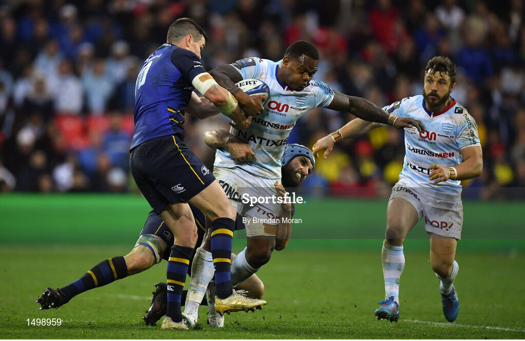 12 May 2018; Virimi Vakatawa of Racing 92 is tackled by Jonathan Sexton and Scott Fardy of Leinster during the European Rugby Champions Cup Final match between Leinster and Racing 92 at the San Mames Stadium in Bilbao, Spain. Photo by Brendan Moran/Sportsfile