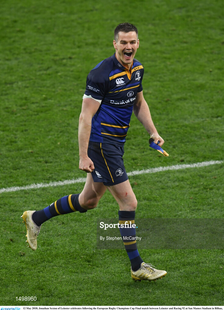 12 May 2018; Jonathan Sexton of Leinster celebrates following the European Rugby Champions Cup Final match between Leinster and Racing 92 at San Mames Stadium in Bilbao, Spain. Photo by Stephen McCarthy/Sportsfile