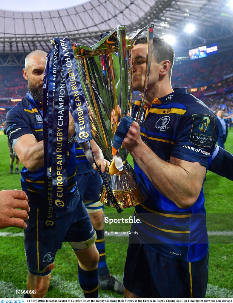 12 May 2018; Jonathan Sexton of Leinster kisses the trophy following their victory in the European Rugby Champions Cup Final match between Leinster and Racing 92 at the San Mames Stadium in Bilbao, Spain. Photo by Ramsey Cardy/Sportsfile