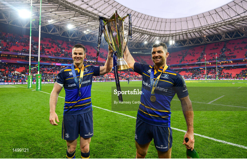 12 May 2018; Jonathan Sexton, left, and Rob Kearney of Leinster following their victory in the European Rugby Champions Cup Final match between Leinster and Racing 92 at the San Mames Stadium in Bilbao, Spain. Photo by Ramsey Cardy/Sportsfile