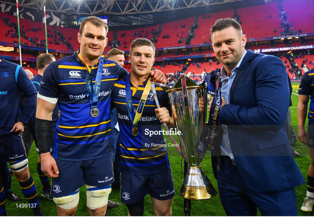 12 May 2018; Rhys Ruddock, left, Luke McGrath, centre, and Fergus McFadden of Leinster following their victory in the European Rugby Champions Cup Final match between Leinster and Racing 92 at the San Mames Stadium in Bilbao, Spain. Photo by Ramsey Cardy/Sportsfile