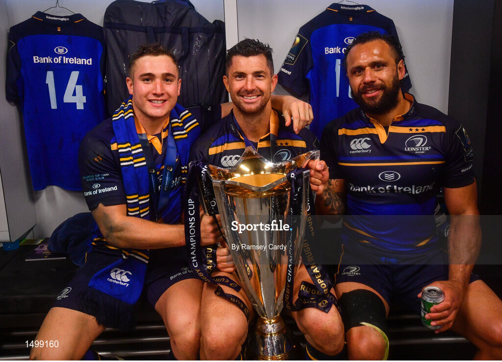 12 May 2018; Jordan Larmour, Rob Kearney and Isa Nacewa of Leinster following their victory in the European Rugby Champions Cup Final match between Leinster and Racing 92 at the San Mames Stadium in Bilbao, Spain. Photo by Ramsey Cardy/Sportsfile