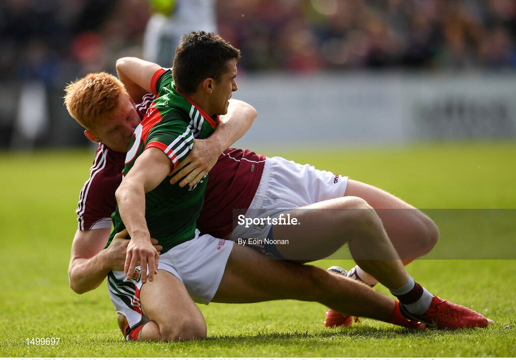 13 May 2018; Peter Cooke of Galway during a coming together with Cian Hanley of Mayo during the Connacht GAA Football Senior Championship Quarter-Final match between Mayo and Galway at Elvery's MacHale Park in Mayo. Photo by Eóin Noonan/Sportsfile