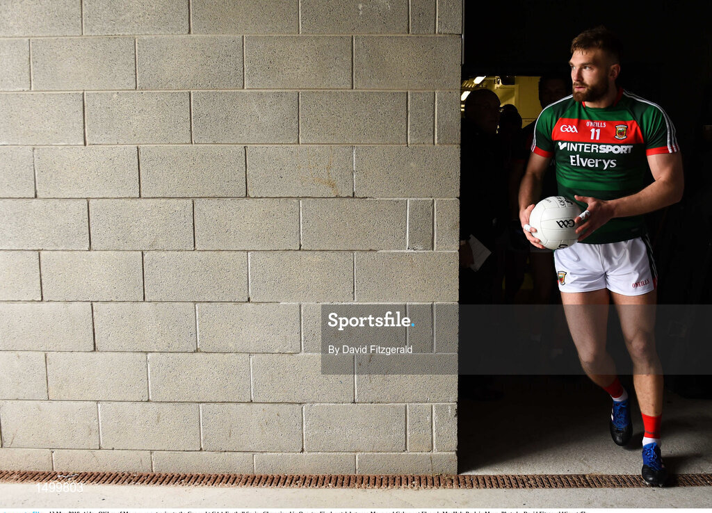 13 May 2018; Aidan O'Shea of Mayo runs out prior to the Connacht GAA Football Senior Championship Quarter-Final match between Mayo and Galway at Elvery's MacHale Park in Mayo. Photo by David Fitzgerald/Sportsfile