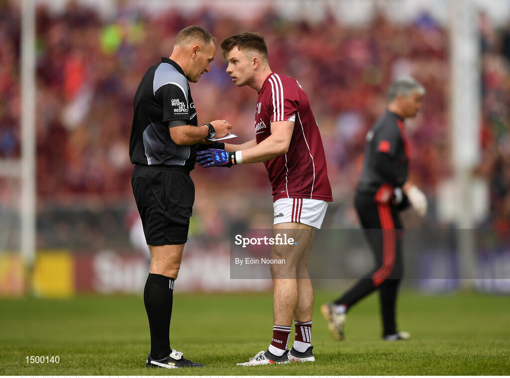 13 May 2018; Eoghan Kerin of Galway protests to referee Conor Lane during the Connacht GAA Football Senior Championship Quarter-Final match between Mayo and Galway at Elvery's MacHale Park in Mayo. Photo by Eóin Noonan/Sportsfile