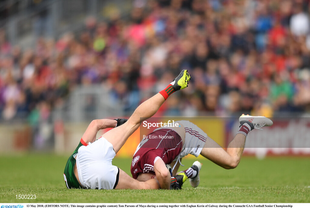 13 May 2018; (EDITORS NOTE; This image contains graphic content) Tom Parsons of Mayo during a coming together with Eoghan Kerin of Galway during the Connacht GAA Football Senior Championship Quarter-Final match between Mayo and Galway at Elvery's MacHale Park in Mayo. Photo by Eóin Noonan/Sportsfile