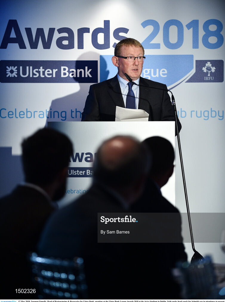 17 May 2018; Norman Ginnelly, Head of Restructuring & Recoveries for Ulster Bank, speaking at the Ulster Bank League Awards 2018 at the Aviva Stadium in Dublin. Irish rugby head coach Joe Schmidt was in attendance to present the awards to the best rugby players and coaches across all divisions of the Ulster Bank League. Photo by Sam Barnes/Sportsfile