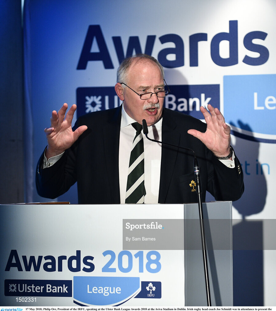 17 May 2018; Philip Orr, President of the IRFU, speaking at the Ulster Bank League Awards 2018 at the Aviva Stadium in Dublin. Irish rugby head coach Joe Schmidt was in attendance to present the awards to the best rugby players and coaches across all divisions of the Ulster Bank League. Photo by Sam Barnes/Sportsfile
