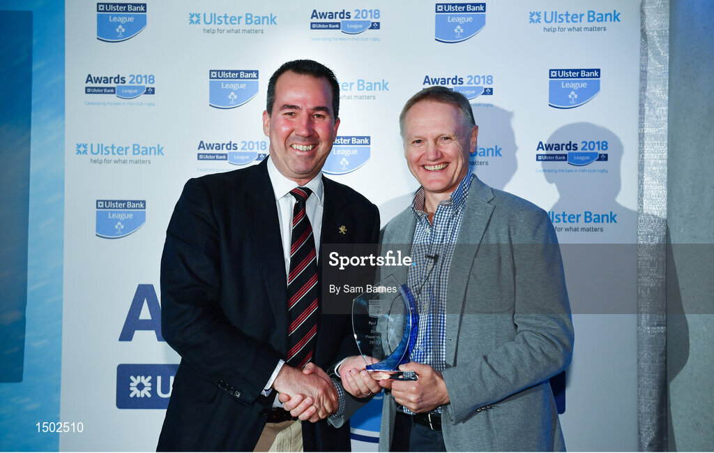 17 May 2018; Paul Kiernan of UCC RFC, Co Cork, is presented with the award for Ulster Bank Division 1B Player of Year Award by Ireland rugby head coach Joe Schmidt during the Ulster Bank League Awards at the Aviva Stadium in Dublin. Photo by Sam Barnes/Sportsfile