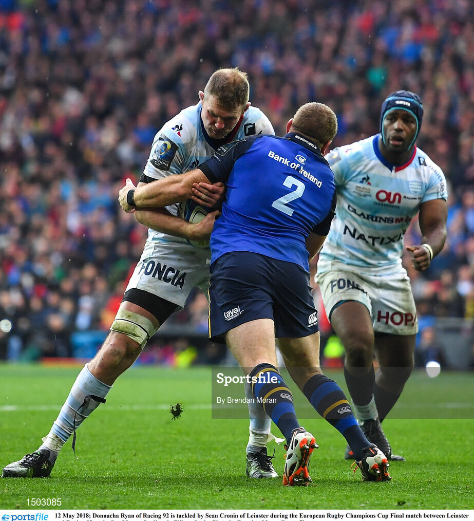 12 May 2018; Donnacha Ryan of Racing 92 is tackled by Sean Cronin of Leinster during the European Rugby Champions Cup Final match between Leinster and Racing 92 at the San Mames Stadium in Bilbao, Spain. Photo by Brendan Moran/Sportsfile