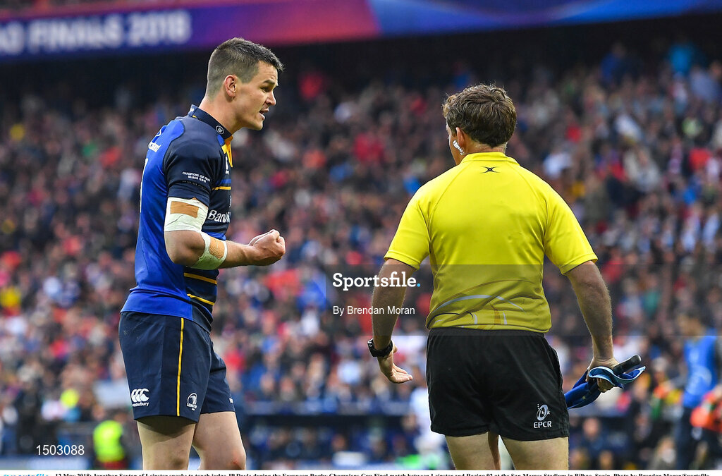 12 May 2018; Jonathan Sexton of Leinster speaks to touch judge JP Doyle during the European Rugby Champions Cup Final match between Leinster and Racing 92 at the San Mames Stadium in Bilbao, Spain. Photo by Brendan Moran/Sportsfile