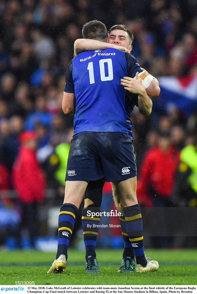 12 May 2018; Luke McGrath of Leinster celebrates with team-mate Jonathan Sexton at the final whistle of the European Rugby Champions Cup Final match between Leinster and Racing 92 at the San Mames Stadium in Bilbao, Spain. Photo by Brendan Moran/Sportsfile