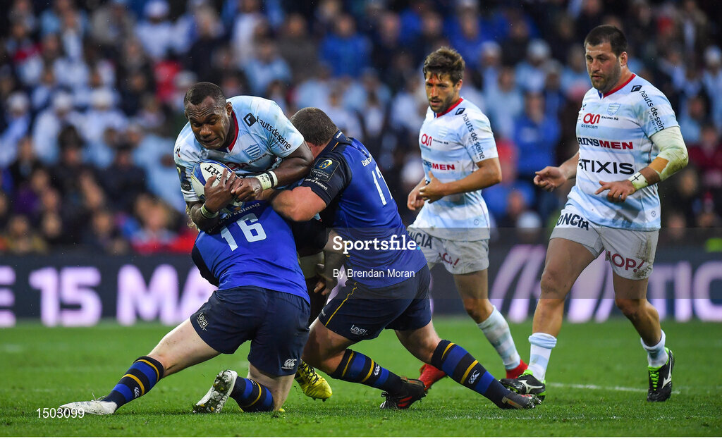 12 May 2018; Leone Nakawara of Racing 92 is tackled by James Tracy and Jack McGrath of Leinster during the European Rugby Champions Cup Final match between Leinster and Racing 92 at the San Mames Stadium in Bilbao, Spain. Photo by Brendan Moran/Sportsfile